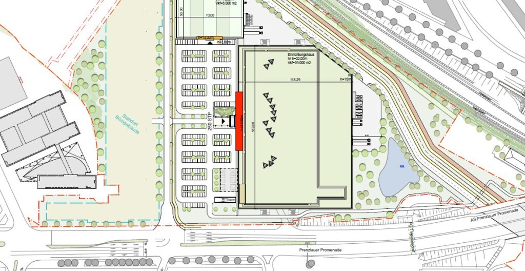 Am anderen Ende des Plangebiets liegt die Prenzlauer Promenade. Alle Entwürfe sollen die vorgegebene Planung für das Fachmarktzentrum übernehmen. Diese ist aktuell ausschließlich auf private Kraftfahrzeuge ausgerichtet.