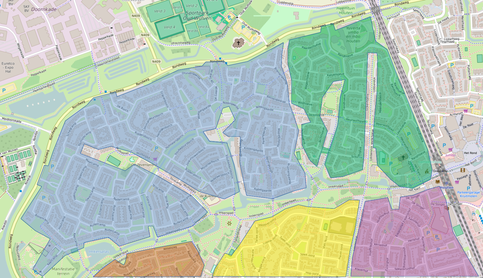 (13) In diesem Kartenausschnitt sind die für Kfz befahrbaren Anliegerzonen farbig markiert. Gut erkennbar sind die Grünzüge mit Rad- und Fußwegen, die nicht nur die Anliegerzonen abteilen, sondern auch in einer Baumstruktur erschließen. So entstehen die direkten und sicheren Radrouten, die gleichzeitig dafür sorgen, dass der Kfz-Erschließungsverkehr jeweils zur umliegenden Hautverkehrsstraße zurückkehrt. Weil Houten von Beginn an so geplant wurde, werden nur an wenigen Stellen Poller als Modalfilter benötigt.
