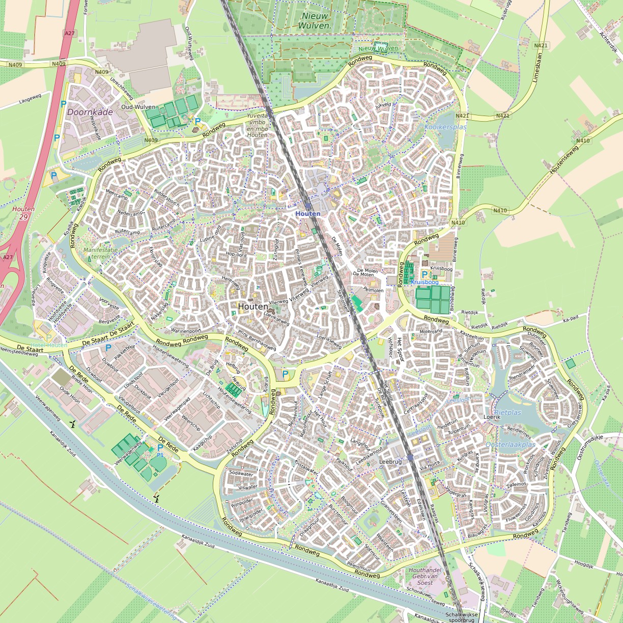 (11) Wer Houten und die Niederlande verstehen will, braucht immer zwei unterschiedliche Kartenstile. Hier sieht man das Durchfahrtsstraßennetz von Houten — per Fahrrad, S-Pedelec, Senioren-Scooter oder zu Fuß.